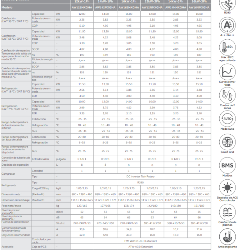• Calefacción (LWT 55 °C / OAT 7 °C) COP: 3,20