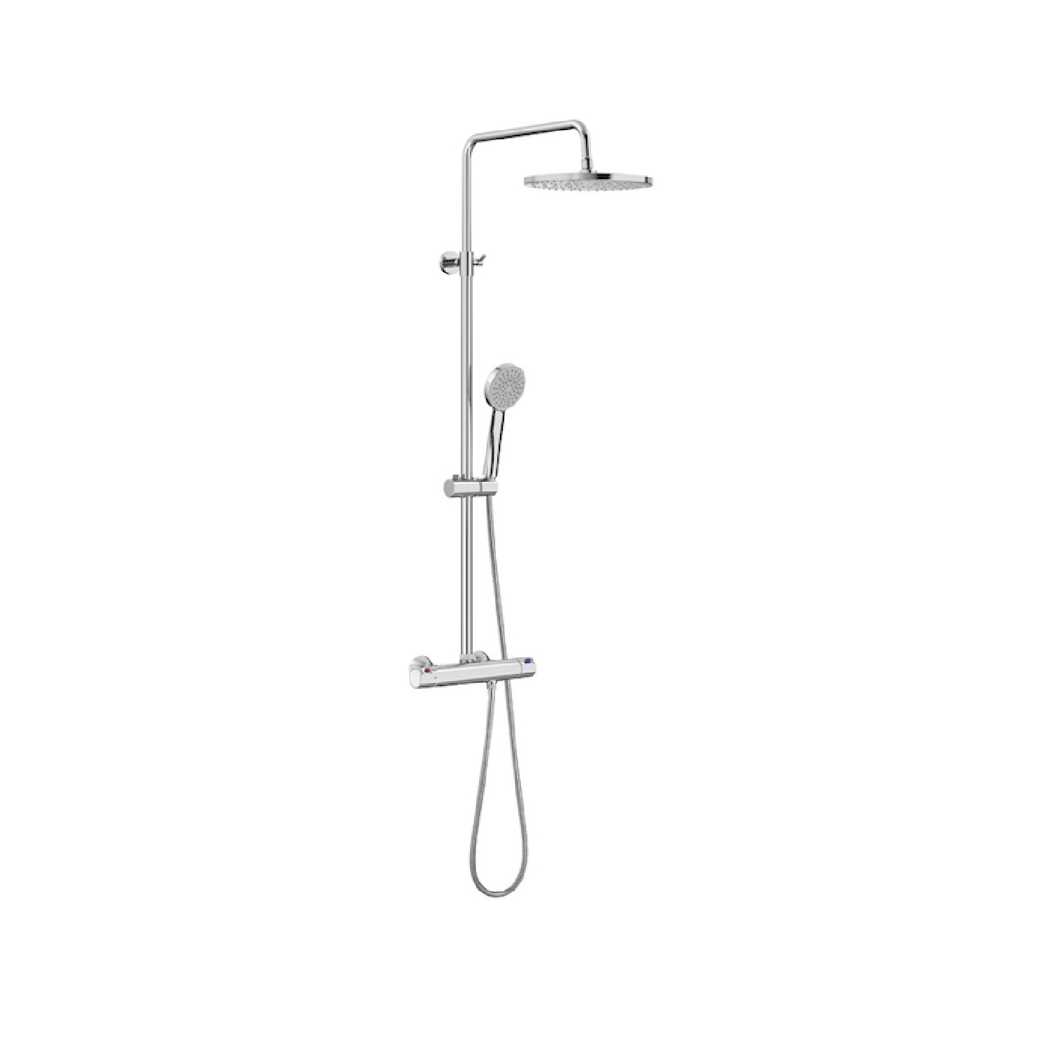 Conjunto de ducha termostático Victoria-T Basic con altura regulable, que incluye barra con rociador redondo, teleducha, flexible de 1.75 mt y soporte articulado regulable en altura.