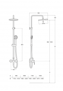 Conjunto de ducha L20 con altura regulable, que incluye barra con rociador redondo de 200 mm diámetro, teleducha, flexible de 1.50 mt y soporte articulado regulable en altura.